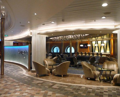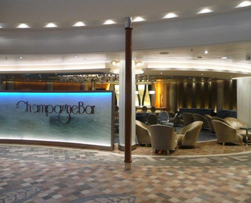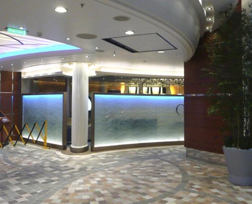 Loistoristeilijä Oceans of the Seas Shampanja baarin etulevyt on käsityönä lasista valmistettu.