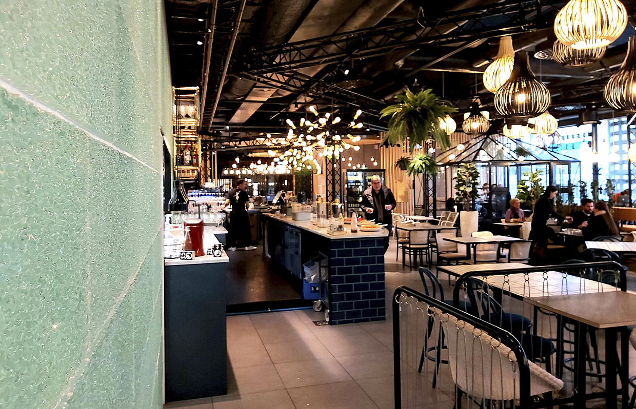 Food & Bar Deliberi Tapiolaan toteutettiin kierrätyslasilaatasta näyttävä katseenvangitsija yhdessä Planovan suunnittelija Maarit Gummeruksen kanssa.