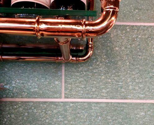 Ravintolan yksi seinistä on laatoitettu kierrätyslasista tehdyillä lasilaatoilla. Kierrätyslasi kimmeltelee lumihiutaleiden tavoin valossa ja tuo tilaan sen extra ripauksen luksusta arjen keskelle.
