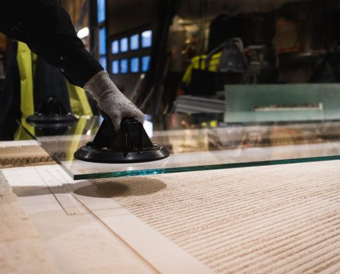 “Valmistamme maailmannäyttelyyn kolme isoa käsintehtyä lasiliukuovea. Kuviot on suunnitellut arkkitehti Gregor Turnsek JKMM Arkkitehdit Oy:stä. Kuviot on tehty käsityönä. Ensin valmistimme muotin lasinsulatusuunin pohjalle ja lasi sulatettiin muotin päälle. Myös ovien vetimet on valmistettu käsityönä lasista sulattamalla”, kertoo Lasilinkki Oy:n toimitusjohtaja Essi Sundman.