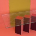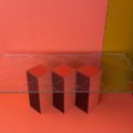 Jam lasipöydän vahvat geometriset muodot, saavat jalka osan näyttämään miltein kuin ilmaan piirretylle kuvalle. Pöydän jalan moniuloitteisuus pääsee oikeuksiinsa kirkkaan hillitysti kuvioidun lasin alta. Jam artesaanilasipöydän punaiset eri sävyt ovat herkullinen kokonaisuus mikä tahansa tilan keskipisteeksi.