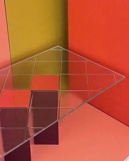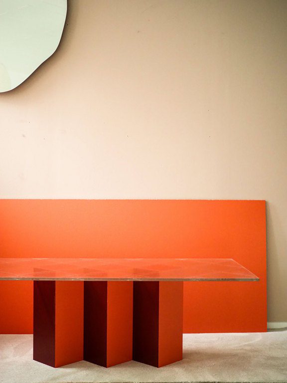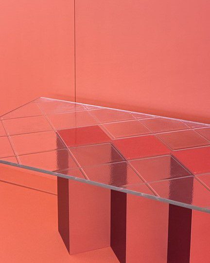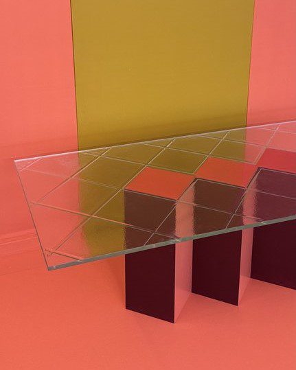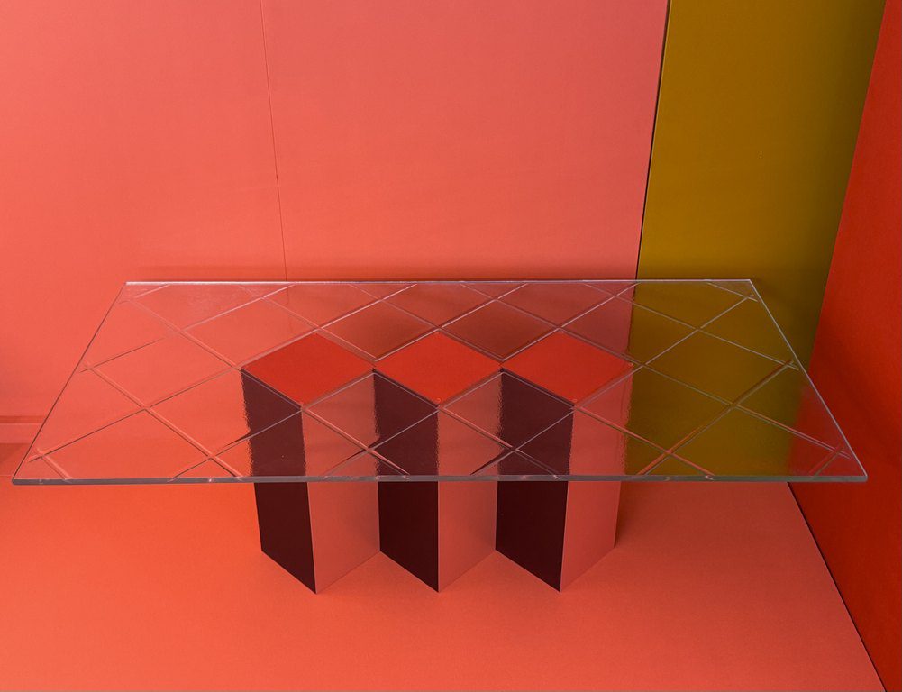 Jam lasipöydän vahvat geometriset muodot, saavat jalka osan näyttämään miltein kuin ilmaan piirretylle kuvalle. Pöydän jalan moniuloitteisuus pääsee oikeuksiinsa kirkkaan hillitysti kuvioidun lasin alta. Jam artesaanilasipöydän punaiset eri sävyt ovat herkullinen kokonaisuus mikä tahansa tilan keskipisteeksi.