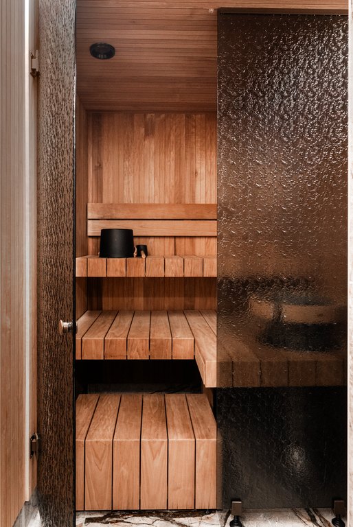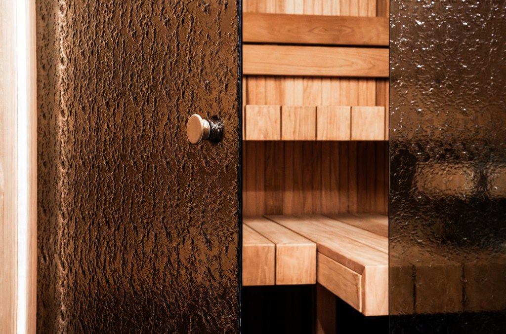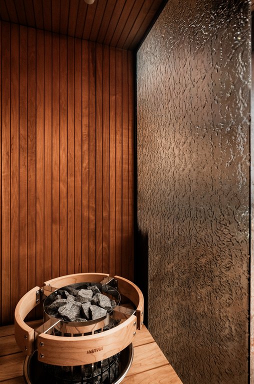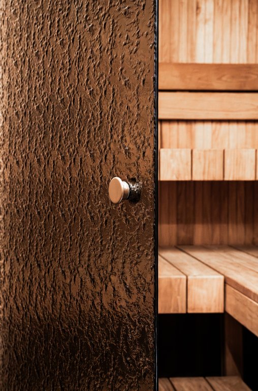 Saunaa kuvataan usein elämyksenä, jopa rituaalina. Harvemmin kuitenkaan pysähdytään siihen, miten suuri merkitys tilan materiaaleilla on juuri tuon kokemuksen syntymisessä. Tässä kohteessa design ei ole vain estetiikkaa, vaan hyvinvoinnin väline – tapa ohjata valoa, rajata näkymiä ja rauhoittaa aisteja huomaamatta. Saunatilojen teksturoitu, pronssinsävyinen artesaanilasi väre kuviolla toimii osana visuaalista ergonomiaa. Se pehmentää kontrasteja, suodattaa kirkkautta ja luo kerroksellisuutta tilaan. Näkymä ei ole täysin avoin eikä suljettu, valo ei häikäise mutta ei katoa. Yksityisyys syntyy kevyesti. Tila jää läpinäkyvän ja umpinaisen väliin ja juuri siinä välissä syntyy rauha.