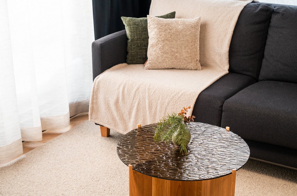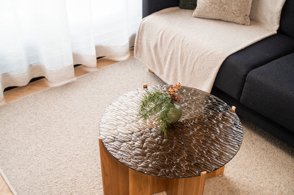 Olotilassa olevat Hetki‑artesaanilasipöydät pronssilasisella kaarna kuosilla tuovat tilaan pohjoisen luonnon grafiikkaa kuin puunkuoren ja ajan piirtämää rytmiä. Orgaaninen lasipinta elää valon mukana ja tuo oleskelutilaan rauhallisen tunnelman joka kutsuu pysähtumään hetkeen.