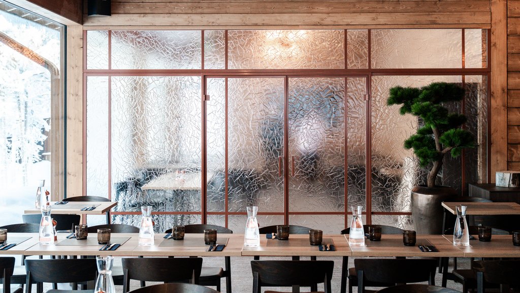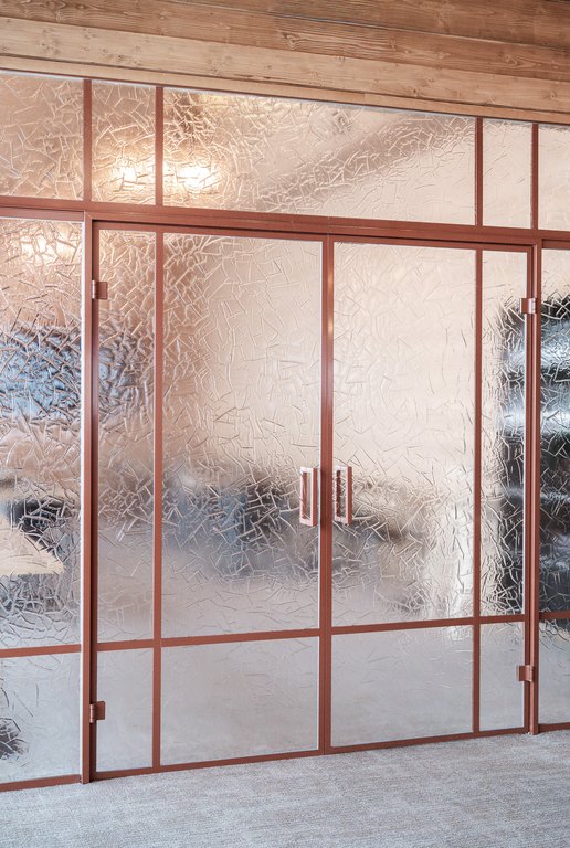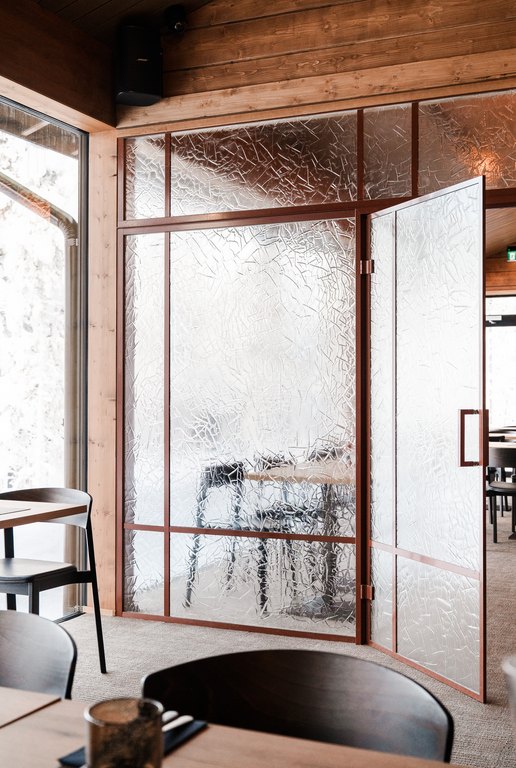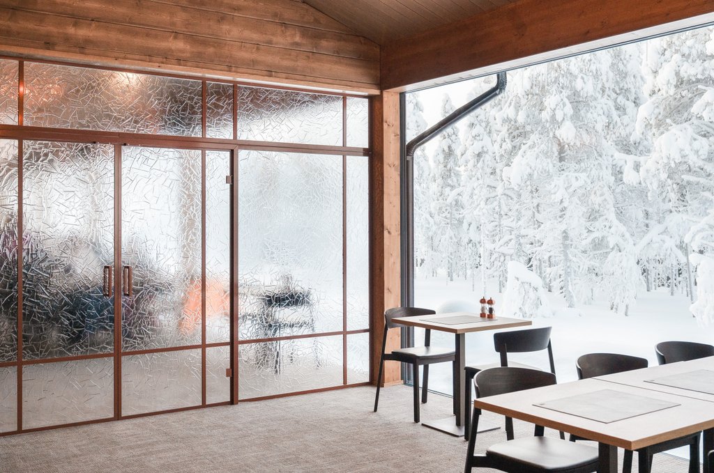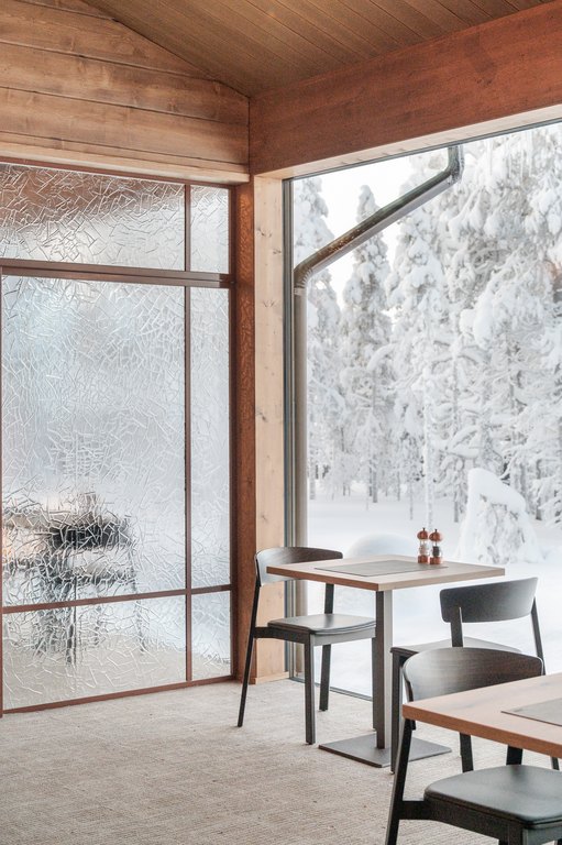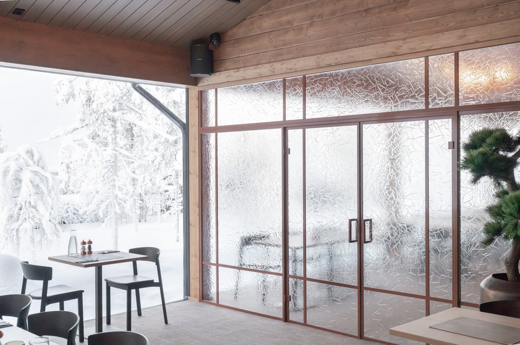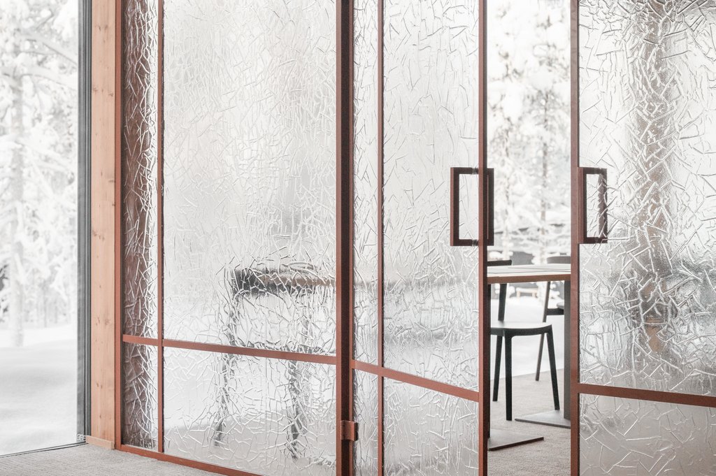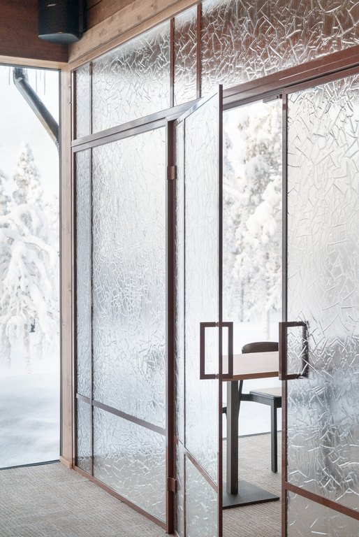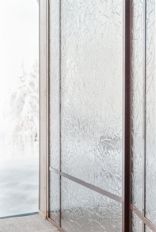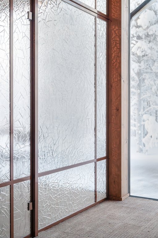 Arktinen luonto ei tässä kohteessa jää vain ikkunoiden taakse, vaan jatkuu tilassa valon, pintojen ja tekstuurien kautta. Wilderness Hotel Saariselkään toteutettu suuri artesaanilasinen lasiseinä pariovilla toimii sekä tilanjakajana että keskeisenä tilallisen tunnelman rakentajana hotellin julkisissa tiloissa.