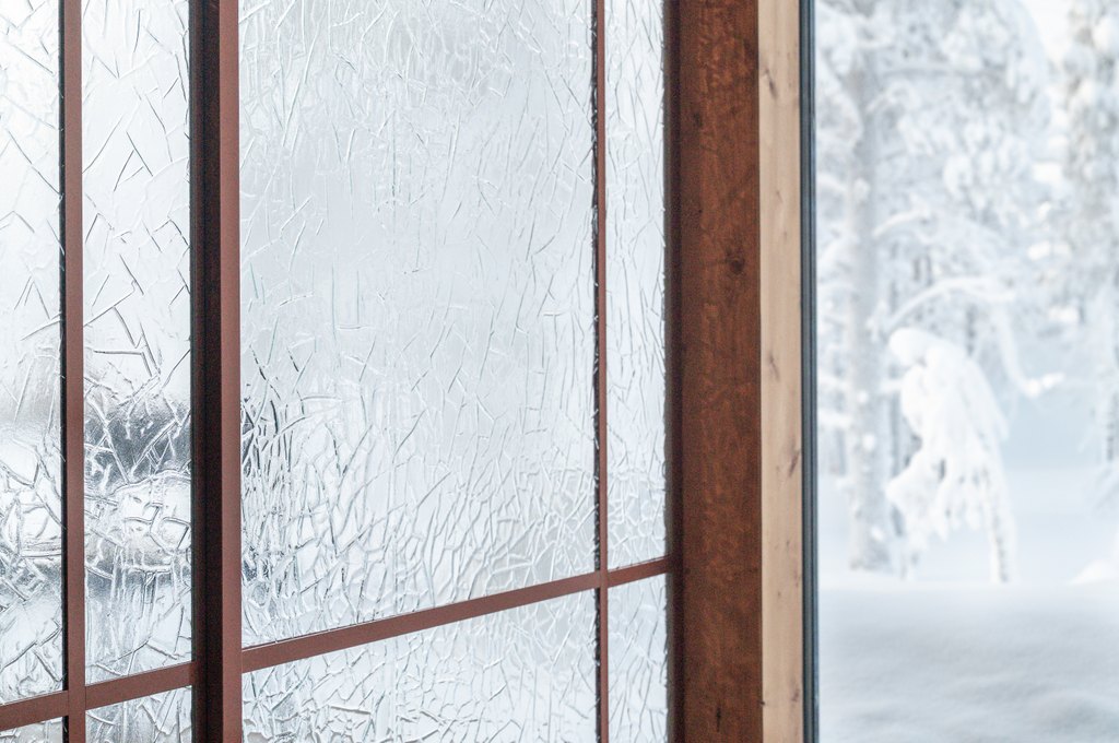 Lasin kuviointi muistuttaa pakkasen ja tuulen piirtämiä jälkiä järven jäähän, luonnon omaa grafiikkaa. Pohjoisen kirkas päivänvalo siivilöityy artesaanilasipinnan läpi ja saa kuvion elämään vuorokauden ja valaistuksen mukaan. Illalla lämmin keinovalaistus rauhoittaa tilaa, mutta käsintehdyn lasin tekstuuri säilyttää voimakkaan, ajattoman ilmeensä.